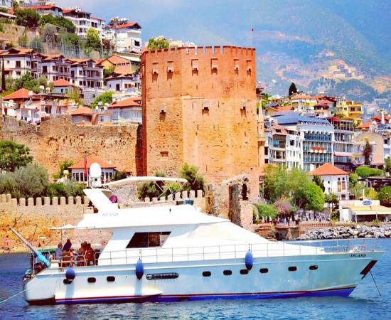 Harika Alanya manzarasında denizin tam ortasında, rüzgar saçlarınızı savururken